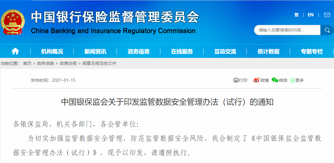 中國銀保監(jiān)會發(fā)布《中國銀保監(jiān)會監(jiān)管數(shù)據(jù)安全管理辦法 (試行)》